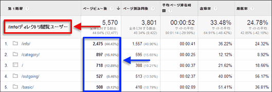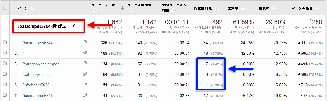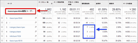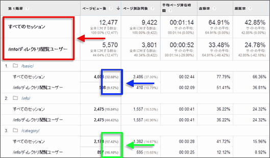 たとえば図7の例では、/basic/ディレクトリは全体の33%のページビューあるのに、セグメントを掛けた場合はページビュー比率が9%と低く(図7青枠部分)、重複閲覧傾向が弱いということになる。