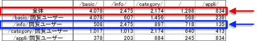 図6の例で言えば、図8のようなマトリクス表にまとめるということだ。全体のディレクトリ別ページビュー数が図8赤枠部分で、「/info/ディレクトリ閲覧ユーザー」セグメントを掛けたディレクトリ別ページビュー数(図6青枠部分)が図8青枠部分に対応するといった具合で作成していく。