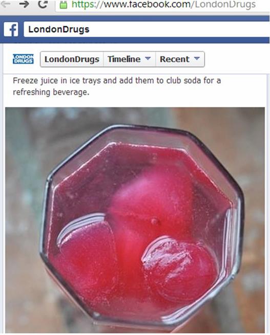 London Drugsはこういった投稿で7万5000件の「いいね!」を獲得しており、「話題にしている人」が、毎週数千人いる。London Drugsが掲載するのはほとんどがFacebookに最適な大きさの画像で、ごくたまに自社の商品やお買い得情報へのリンクを載せる。画像は実用的で、愉快なものもときどきある。こういったページはブランドを構築できる。