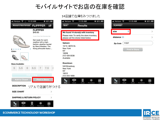 この目的を実現するために同社では、ECサイトで販売している商品には、必ず「実店舗でこの商品をみつける」というリンクを設置。iPhoneアプリでも、モバイルサイトにアクセスすると「リアル店舗でみつける」というボタンを設置している。そうすることで、店頭においてもネットからのスムーズな流れで商品を見つけやすくしているのだ。