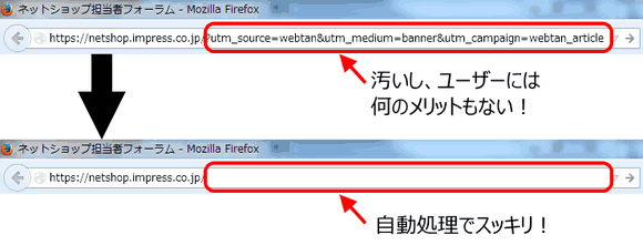 すでにネットショップ担当者フォーラムのサイトに実装していますので、試してみたい方は、以下のURLを、トラッキングパラメータが付いていることを確認したうえでクリックして、ブラウザのロケーションバー(URLが表示されるところ)を見てください。