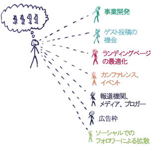 報道機関やメディア、ブロガーに対しては「どう取り上げてもらえるか?」と考え、Webサイト上に広告枠があれば「この広告枠をどう費用対効果(ROI)につなげるか?」を考え、ソーシャルメディアを開けば「私がシェアするトピックに関心のある人々に、フォローしてもらい、顧客になってもらい、私のコンテンツを拡散してもらうにはどうすればいいか?」と考える。