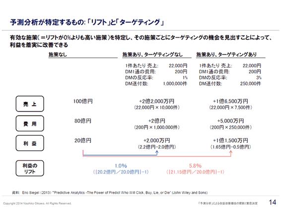 また、DMをすべての顧客に対して送るのではなく、ターゲティングによって絞り込んで反応率を上げれば、全体の売上自体は下がったとしても、DMのコストを大幅に削減できるので利益のリフトを高くできる。「予測分析によってリフトがクリアになる。また、施策を投入するときに反応が特に良いセグメントを見極めてターゲティングを行うことによって、費用対効果が高まる