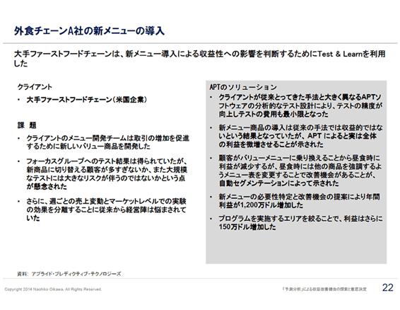 続いて、外食チェーン店においてセットメニューの投入でどれだけ売上を上げられるか、APTの分析ソフト「Test&Learn」を用いた事例が示された。従来の実験計画法では、収益に貢献できないと考えられていた新しいバリューメニューが、APTのコントロール群手法によってターゲティングを行えば効果があると予測され、実際に新メニューを投入することで売上を伸ばすことができたという。