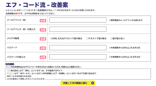 「メールアドレス」「メルマガ配信」「パスワード」という見出しを省略することで、ぐっとコンパクトなレイアウトになりました。ファーストビューの横幅1000px、高さ550pxというサイズの領域に収まっているかどうかは、実際の表現で調整して検証する必要はありますが、少なくとも、ぐっと見やすくなり、印象が良くなっているのではないでしょうか?