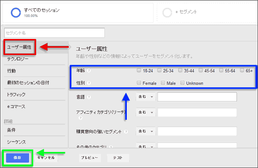 新たなセグメントを作成して、性別・年齢別で分析できるようにする方法