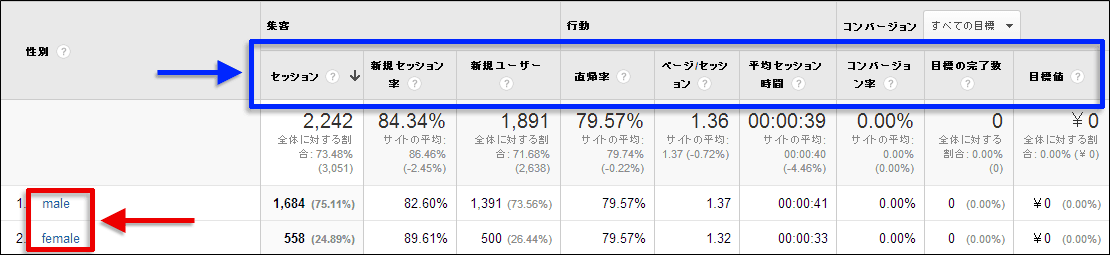 まずは[ユーザー]>[ユーザーの分布]>[性別]レポートを確認してみよう。