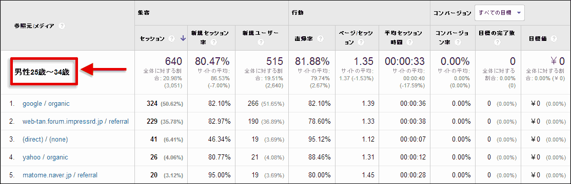 そして、たとえばターゲットが25歳~34歳の男性だということであれば、そのセグメントに絞ってまずどの集客チャネルが成功しているかを見てみよう。図7は[集客]>[すべてのトラフィック]レポートに対して、あらかじめ作成しておいた「男性25歳~34歳」というセグメント(図7赤枠部分)で絞り込んだレポートの例だ。