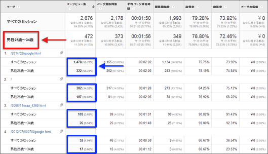 4つのページのページビュー数について、「すべてのセッション」と「男性25~34歳」の閲覧している人の割合を比べてみると、「すべてのセッション」よりも「男性25~34歳」の方が割合は大きい(図8青枠部分)。よって、このデータを見る限りでは、限りでは、これら上位のページは、全体よりも該当ターゲットに届いているページだと言えるだろう。
