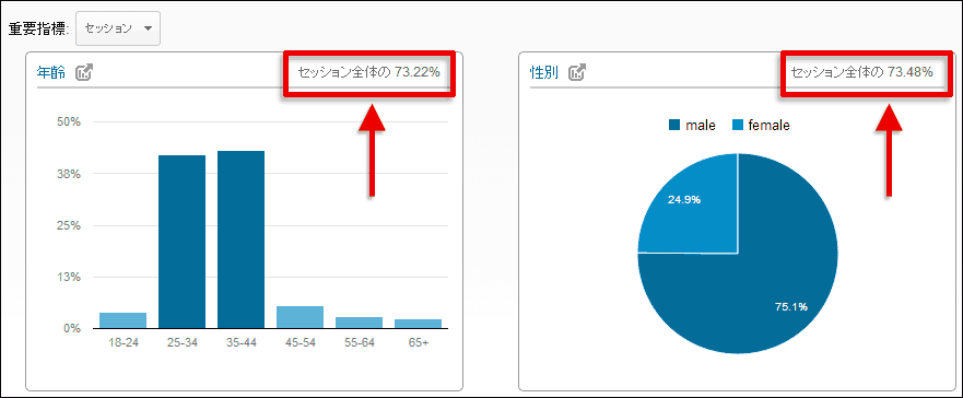 ただ、この「年齢」と「性別」のデータは、推計値であるため精度が高いとも言い切れないし、それらの属性が推定できた割合も100%というわけではない。図6~図8で紹介したデータのレポートでは、実は年齢も性別も全体の73%程度(図9赤枠部分)が推定できたに過ぎないというのが、[ユーザー]>[ユーザーの分布]>[サマリー]レポートを見るとわかる。