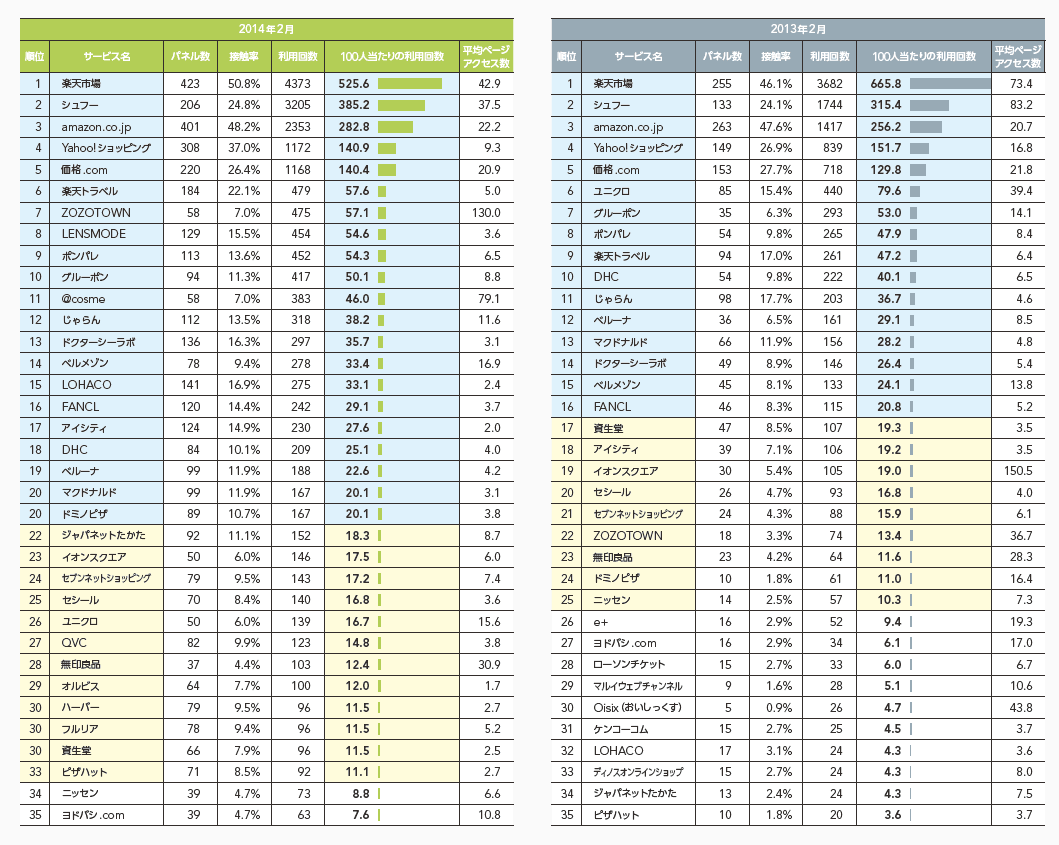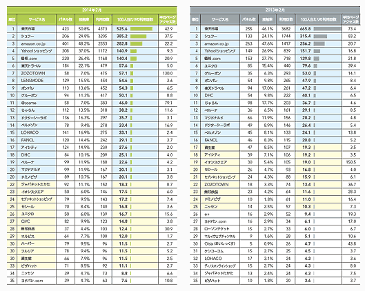 次に、100人当たりの利用回数を2014年2月、2013年2月とで比較した表(図2)をみると、20回以上を記録したサービス(水色で表記)の数が対前年同月比で約30%増えている。オレンジ色で示された10回以上を記録したサービス数も同率で増加しており、接触率のみならず、サービスの利用回数という観点からも増加傾向にあることがわかる。すなわち、一人のユーザーがより多くのECサービスを、以前よりも頻度高く利用するようになってきたといえよう。