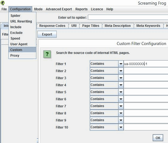 これをさらに詳しくチェックするには、Screaming Frogを起動し、カスタムフィールドをアップデートして適切なトラッキングIDをチェックしてほしい。