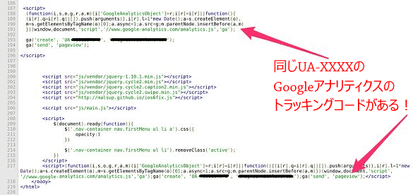 これを見つけるいちばんの方法は、ソースコードを表示して、「UA-」を検索することだ。