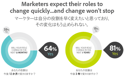 多くのマーケターはどのように考えているのだろうか。先ほどと同様の調査であるが、「自分の果たす役割が変わっていくと思うか」という質問に対しては、64%のマーケターが12か月以内に変わると答えたという。さらに、3年以内に変わると答えたのは81%に上る。