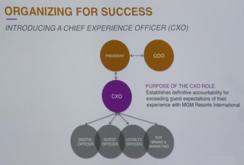 MGMには、「顧客理解」の専任責任者として、「CXO」(チーフエクスペリエンスオフィサー)が存在している。「顧客満足」を高めることを狙いとして、戦略立案から指揮統括も行う立場で、社長直轄の役職だ。