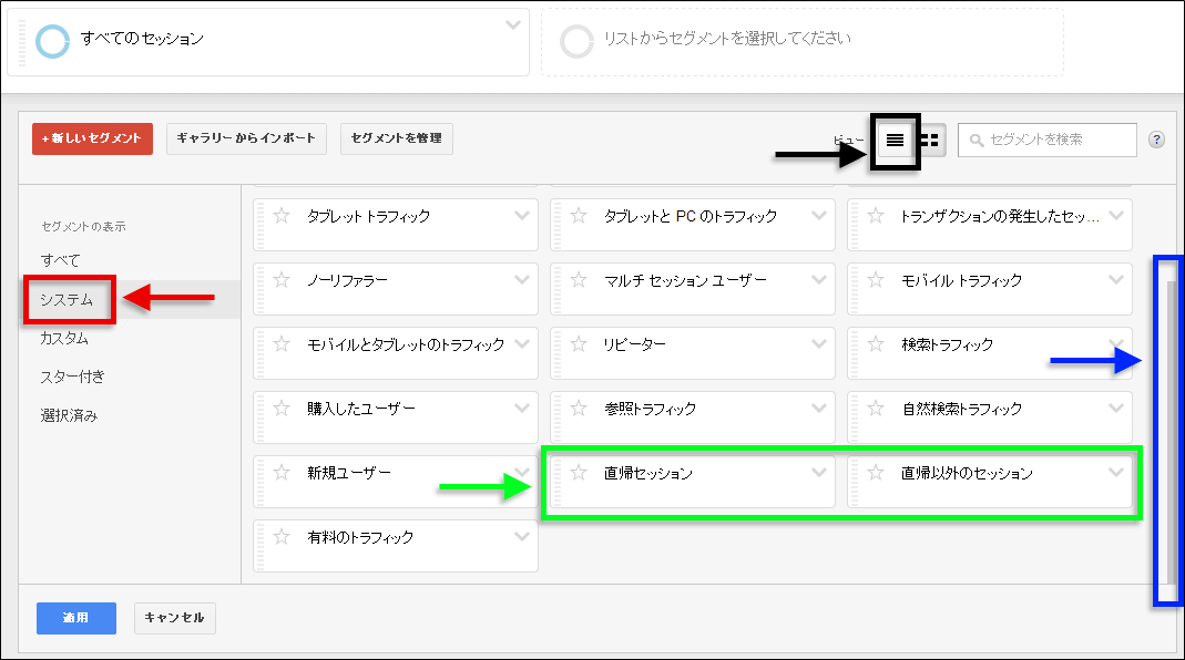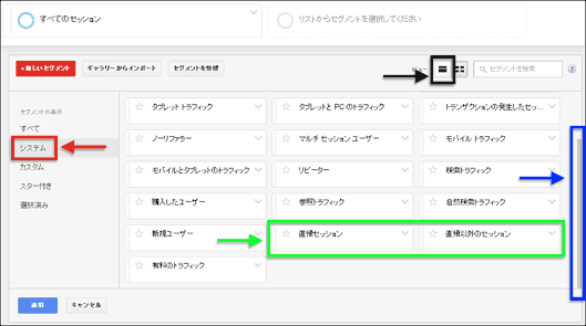 右側のスクロールバー(図2青枠部分)を一番下まで移動させると、ここにお目当ての「直帰セッション」と「直帰以外のセッション」の2つがあるのがわかる(図2緑枠部分)。
