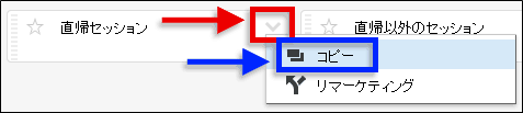 この「直帰セッション」とはどのような設定なのかを確認しておこう。「直帰セッション」セグメントの右側にある[v]のようなマーク(図3赤枠部分)をクリックする。すると右下に「コピー」「リマーケティング」の2つが表示されるので、「コピー」(図3青枠部分)をクリックしよう。