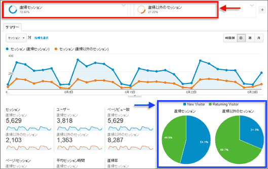 図5青枠部分を見ていただきたい。直帰セッションの過半数(54.1%)が「New Visitor」すなわち新規訪問で占められているのに対して、直帰以外のセッションは「Returning Visitor」すなわちリピート訪問が68.7%と7割近く占めている。
