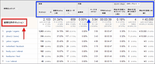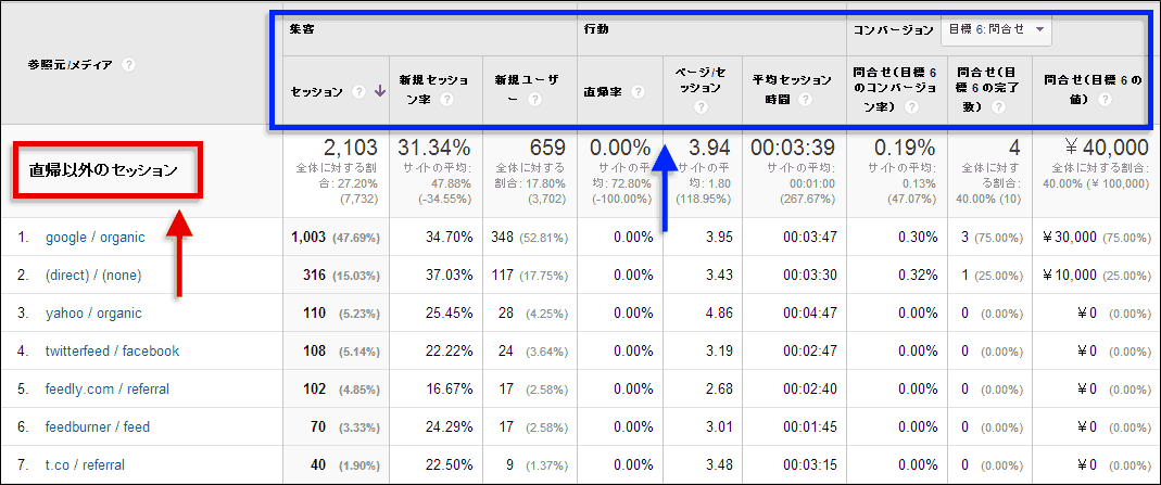 「直帰以外のセッション」で絞り込むと、見込みのないお客さん(直帰セッション)を除いて、どこが効率よい集客チャネルなのかを見ることができるようになる。「すべてのセッション」と優劣は似通っているかもしれないが、「直帰以外のセッション」セグメントで絞り込むことで、より傾向が鮮明になるはずだ。デフォルトで選択されているサマリー指標グループであれば、図6青枠部分のように集客状況、サイト内回遊状況、成果に結びついているかという指標群で一望することができる。