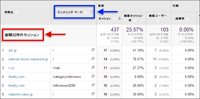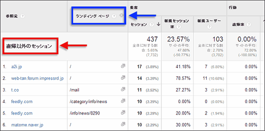 このレポートはセッション数が多い順に並んでいる。上に表示されているほど、直帰しなかったセッションが多かった「参照元」×「ランディング ページ」の組み合わせである。ということを表している。想像していなかった組み合わせはないか確認しておこう。