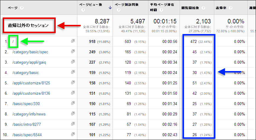 見るポイントは、どこが閲覧開始ページになっているかという点だ。閲覧開始数の指標(図8青枠部分)を確認しよう。