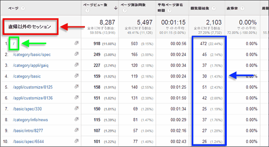 直帰以外のセッションで、どのコンテンツが多く閲覧されたのかを確認するには?