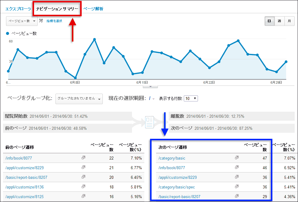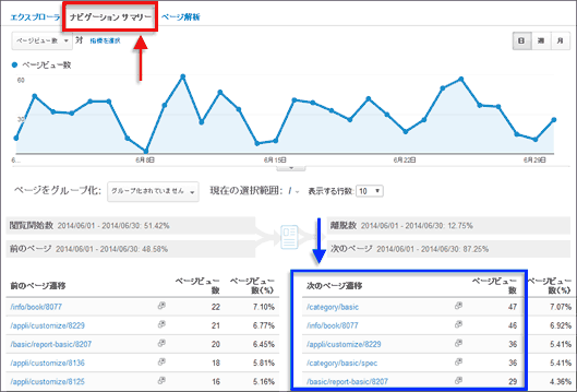 注目したいページがあったら、そのリンク(図8緑枠部分)をクリックし、該当ページに絞り込んだうえで、「ナビゲーション サマリー」タブを選択(図9赤枠部分)しよう。