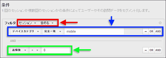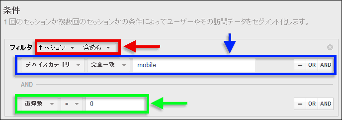 最後におまけとして、「直帰以外のセッション」に、「モバイル(スマートフォン)からの利用セッション」の条件を掛け合せたセグメントの設定方法を紹介しておく。