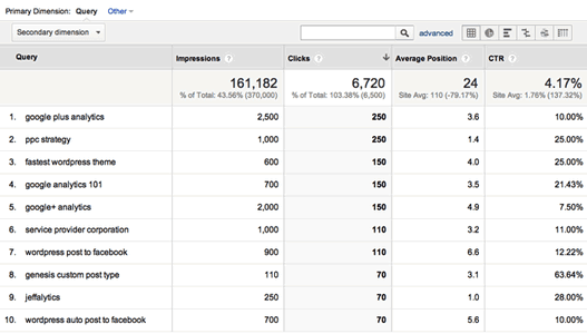 このレポートは、AdWordsアカウントからのデータとGoogleウェブマスターツールからのデータを合体させたもので、キーワードがもっとも有効な範囲を理解するのに役立つ。