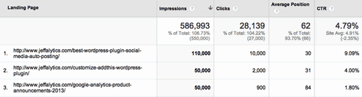 そうすれば、Google検索の各キーワードの表示回数、クリック数、クリックスルー率などがわかってくる。きわめて信頼性の高い情報だというわけではないが、データは徐々に改善されている。