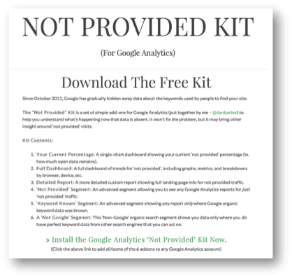 そのような専門家のひとりがダン・バーカー氏だ。Googleアナリティクスのキーワード欄に「(not provided)」が頻出するのにうんざりした同氏は、この問題の対処に特化したリソースを揃えたウェブサイトを作った。
