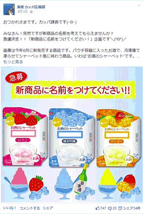 キャンペーン内容は投稿で告知し、Facebookのメッセージで投稿してもらうという方法だったのですが、89件の応募がありました。良い名前をたくさん応募していただき、そのうち、最終候補が2つ残りました。なかなか決まりませんでしたが、候補の2つの折衷案として「お酒のシャーベット シャリッと」になりました。