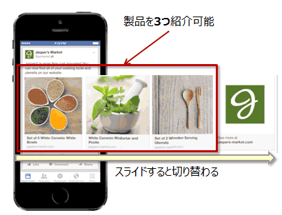 Facebookは、新しい広告メニュー「マルチプロダクト広告」を発表しました。デスクトップでもモバイルでも、1つの広告ユニットで3つの製品を紹介できるメニューです。