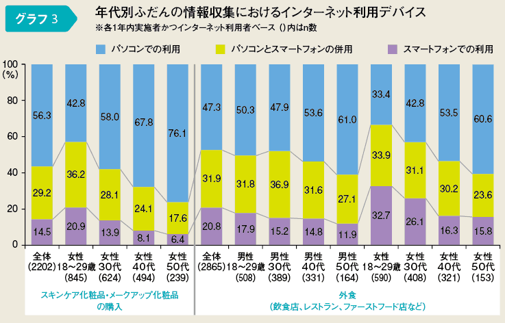 性年代別・カテゴリ別で比率を見てみると、「スキンケア化粧品・メークアップ化粧品の購入」では、スマートフォン利用者計(「スマートフォンのみ利用者」、「パソコンとスマートフォン併用者」の合計)は、「女性18~29歳」が57.1%ともっとも高い比率となり、年代が上がるほど比率は減少していた。「外食」では、男性では「男性30代」が52.1%、女性では「女性18~29歳」が66.6%ともっとも高い比率となった。男女とも年代があがると比率が低下する傾向が見られた。また、すべての年代で、女性が男性の比率を上回っていた【グラフ3】。