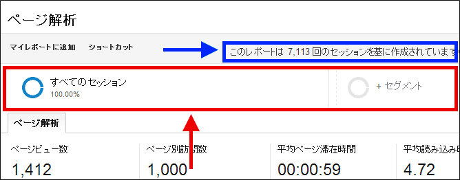 「ページ解析」([行動]>[ページ解析]レポート、あるいは[行動]>[サイト コンテンツ]>[すべてのページ]レポートの「ページ解析」タブ)にはセグメント機能の表示(図2赤枠部分)があり、一見セグメントが掛けられるように見える。