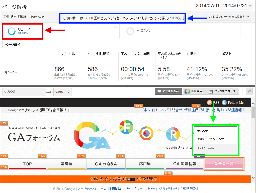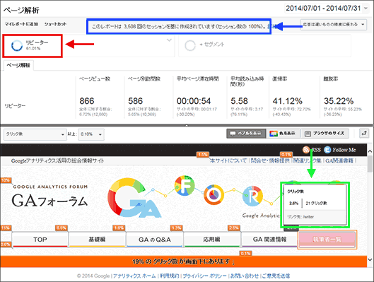 このレポートはクリック率表示なので、たまたま率が同じだったと思うかもしれないが、各パーセント表示の部分にマウスオーバーすると表示されるクリック数の明細を確認する(図3緑枠部分)と、セグメントを掛けていないレポートの数値と一致していることが確認できる。つまりこのレポートでは実質的に、セグメント機能が稼働していないと考えられる。