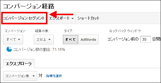 図4は[コンバージョン]>[マルチチャネル]>[コンバージョン経路]レポートの左上部分だが、レポート名の直下の部分に「コンバージョン セグメント」という表示がある(図4赤枠部分)。