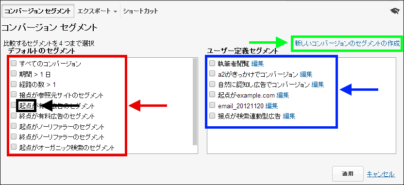 またコンバージョン系のレポートの中には、まだご紹介していない「コンバージョン セグメント」(表中のCS)という種類の特殊なセグメントもある。そういったものも含めて、順番に解説していこう。