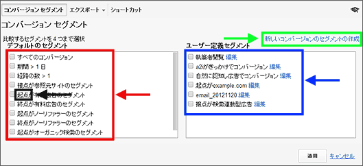 デフォルトのセグメントの「起点」という表記(図5黒枠部分)は初回訪問を意味し、「終点」はコンバージョンしたセッションを意味している。