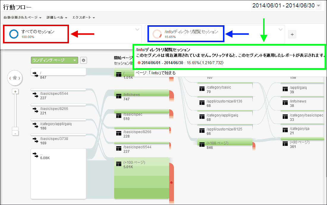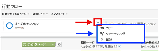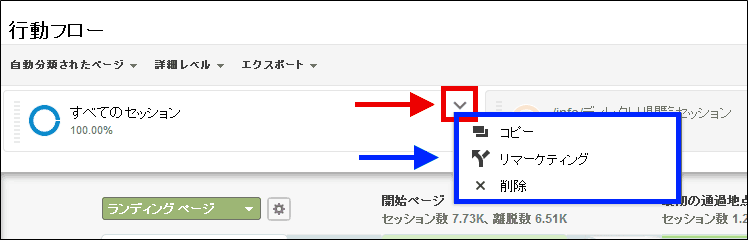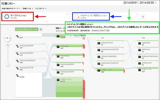図6は[行動]>[行動のフロー]レポートで、「すべてのセッション」(図6赤枠部分)に追加して、とあるセグメントを指定(図6青枠部分)して表示したものだ。