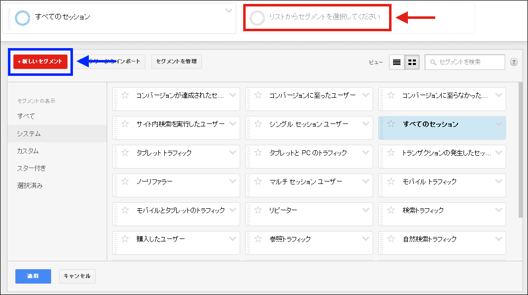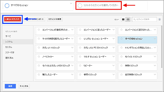 セグメントを掛けるため、例によって、図2赤枠部分をクリックしてセグメント機能を立ち上げ、「+新しいセグメント」(図2青枠部分)をクリックして、セグメント作成画面(図3)に移動しよう。