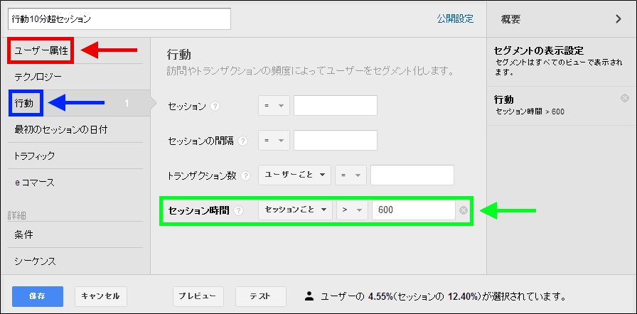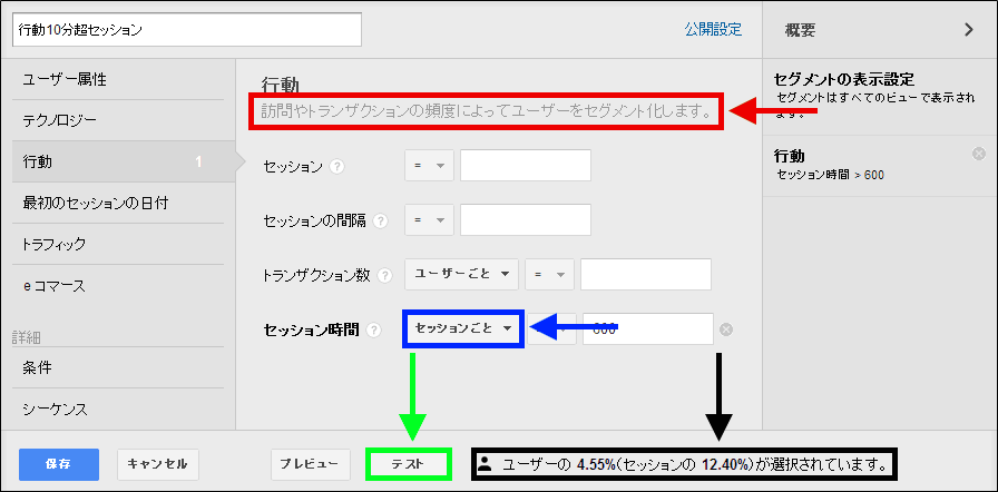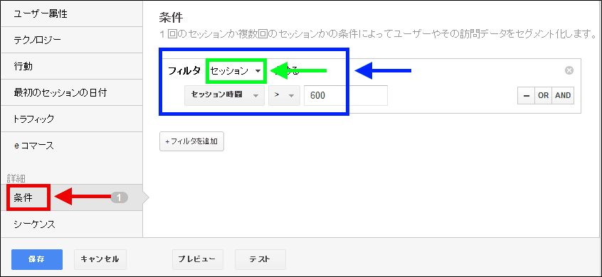 この中に「セッション時間」を設定する箇所がある(図3緑枠部分)。今回指定したい条件は「10分(600秒)を超えて滞在したセッション」に絞り込むためのセグメントなので、図3緑枠部分のように、「セッション時間がセッションごとに600秒を超える」という指定で問題ないように思える。