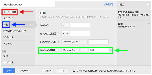 先月のセッション時間(訪問滞在時間)の合計が600秒を超えるユーザー。たとえば先月3回セッションがあり、それぞれのセッション時間が250秒、200秒、300秒だったユーザーは、合計セッション時間が750秒なので、このセグメント対象となる。そして「ユーザー」ベースなので、このユーザーの3回のセッション全部が集計対象になる。つまり、一度も600秒を超えるセッションのないユーザー行動も対象になる。セッション時間がセッションごとに600秒を超えるユーザー条件