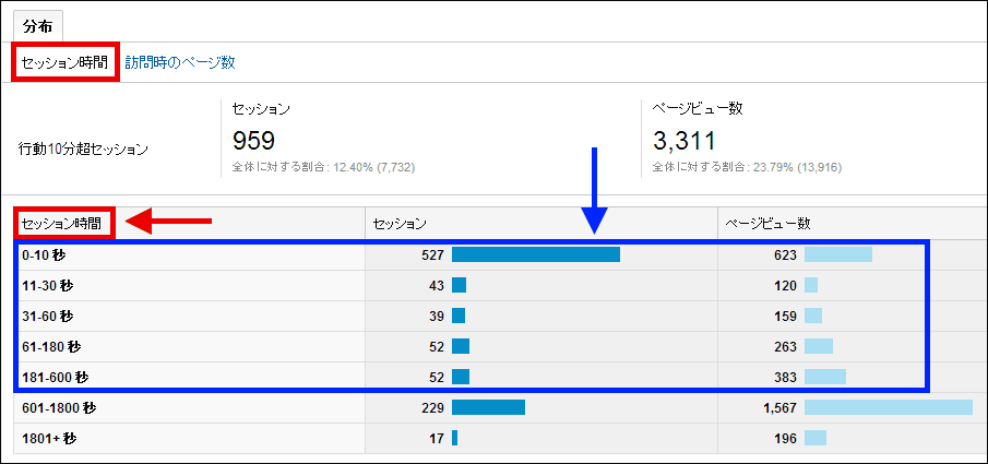 しかし、セッション時間が600秒を超えるセッション条件で絞り込んだつもりなのに、600秒以下のセッションも含んでいる(図4青枠部分)。偶然このレポートに該当セグメントを掛けたので、何かおかしいことになっているということが確認できたが、他のレポートに掛けていたらおかしいことになっていることには、たぶん気がつかないだろう。