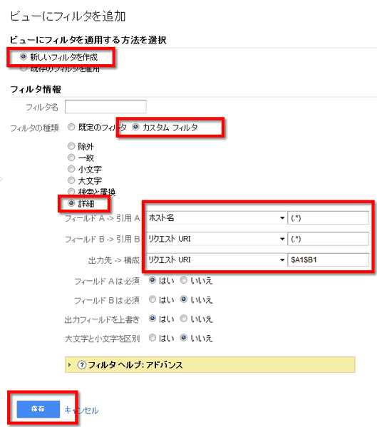 フィールドA ホスト名 引用A ホスト名(ドメイン名)を取得し、フィールドAに格納する。 フィールドB リクエストURI引用 URI(パスとファイル名)を取得し、フィールドBに格納する 出力先 リクエストURI構成 ホスト名(A)とURI(B)を連結して、通常レポートのURIの個所に出力する