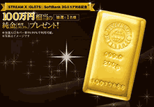 まずは、「100万円相当の純金プレゼントキャンペーン」です。これはスマートフォン「STREAM X(GL07S)」がソフトバンクモバイルの3G通信「SoftBank 3G」に対応したことを記念しているのですが、純金の純度が99.9%であることがポイントです。SoftBank 3Gの全国人口カバー率が99.9%であることにかけているのです!