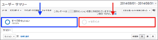 まずレポート画面の上部にある「+セグメント」(図1赤枠部分)のエリアをクリックしよう。ブラウザ表示の横幅が狭い場合は、すべてのセッション(図1青枠部分)の下に並んで表示される。
