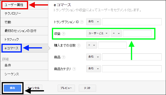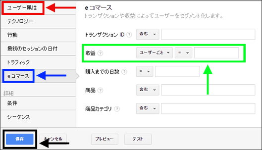 今回のセグメント「eコマースサイトで一定金額以上を購入しているユーザー」の条件設定は、図3緑枠部分で行う。「収益」とは、eコマースのトラッキングコードで収集した販売額のデータを意味する指標だ。
