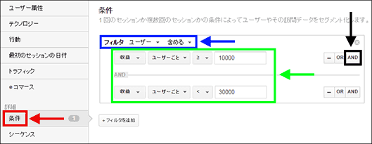 ユーザー単位で絞り込みたいので、フィルタの指定は「ユーザー」「含める」と指定(図5青枠部分)し、購入金額の条件は図5緑枠部分のように、