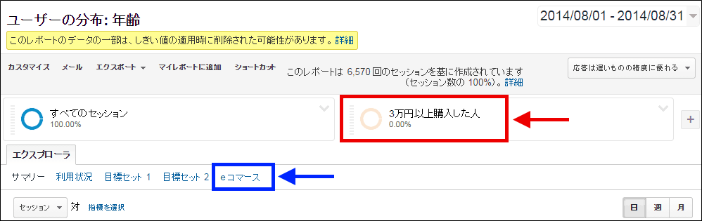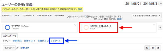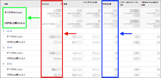 セッション数(図7赤枠部分)や平均注文額(図7青枠部分)について、全体と「3万円以上購入した人」セグメント(図7緑枠部分)を比較する、あるいは購入者全体と「3万円以上購入した人」セグメントを比較することで、高額購入ユーザー層にどのような特徴があるのかを見てみよう。
